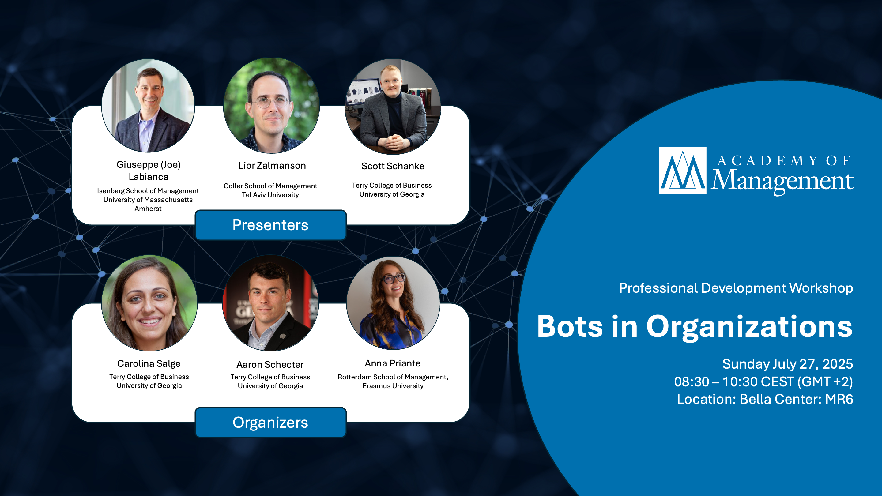 We invite you to our PDW "Bots in Organizations" on Sunday July 27, 2025, from 08:30 AM – 10:30 AM (CEST, GMT +2) at the 2025 AOM Conference in Copenhagen!